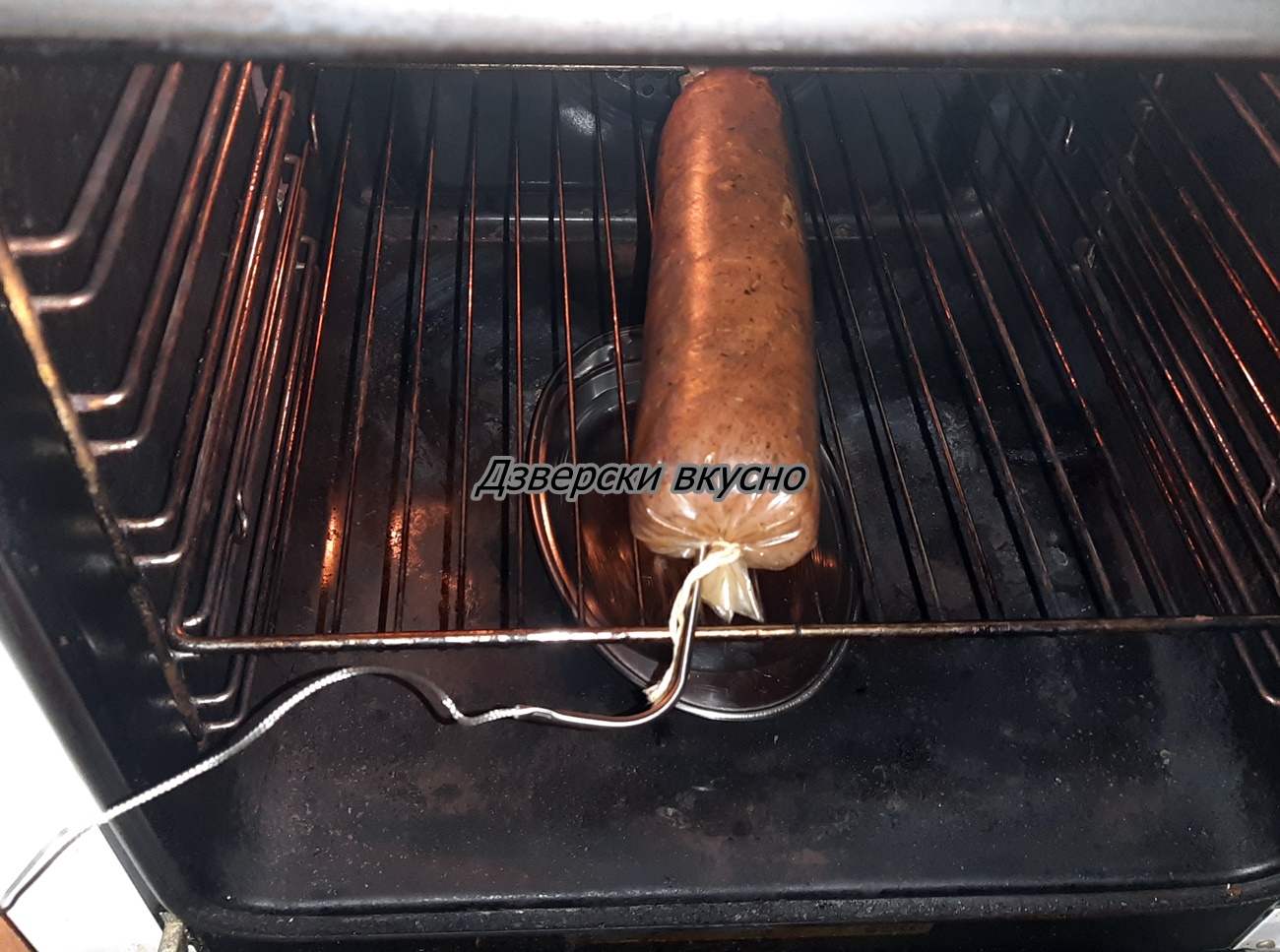 Забичваме му термометъра в най-дебелата част, бухваме във фурната върху решетка... Наглася се термоиглата на 71С и се оттегляме да си гледаме филма по ТВ-то.